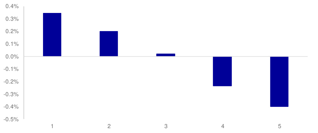 - 5组行业分组中,因子值越大对应行业未来收益越高,极值组差异明显。
