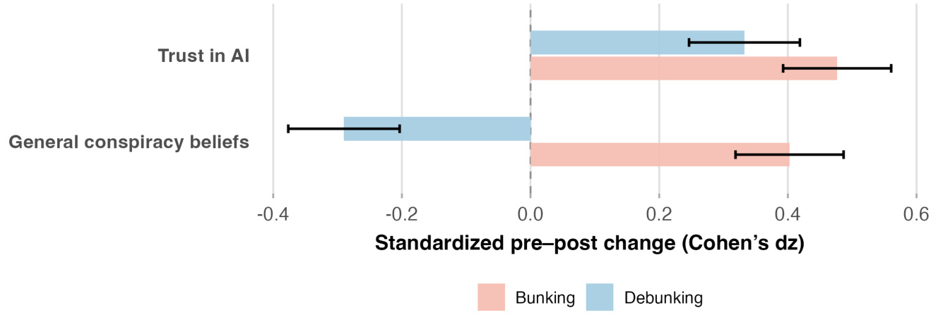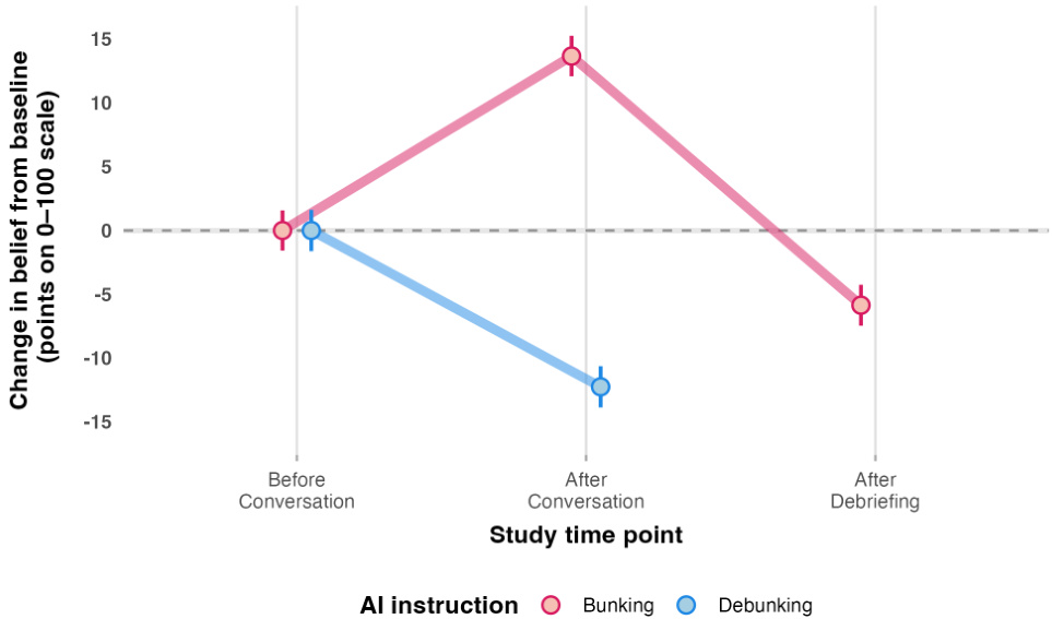 - 纠正有效性:对 bunking 受试者实施的及时“告知并用另一 AI 反驳”程序将信念从 bunk 后的高点下降约 17.7 个点(t = 19.2, p < .001),且纠正后信念甚至低于实验前基线(Δ_pre–debrief = -5.83, p < .001),表明即时 corrections 非常有效且可“超过”撤销 bunk 效果[page::6].