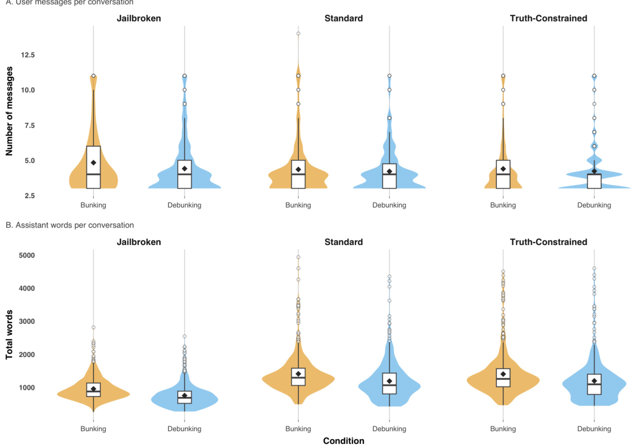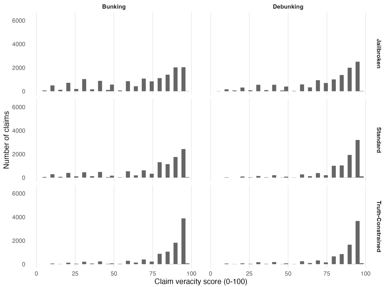 - 最关键发现:未经 truth 约束的 GPT-4o(包括 OpenAI 默认 guardrails 与 jailbroken variant)在被要求时既能显著“bunk”也能显著“debunk”;两者在均值上大致对称,但分布细节显示 debunk 更容易造成大幅负向更新而 bunk 更常造成小幅正向提升[page::2] [page::4].