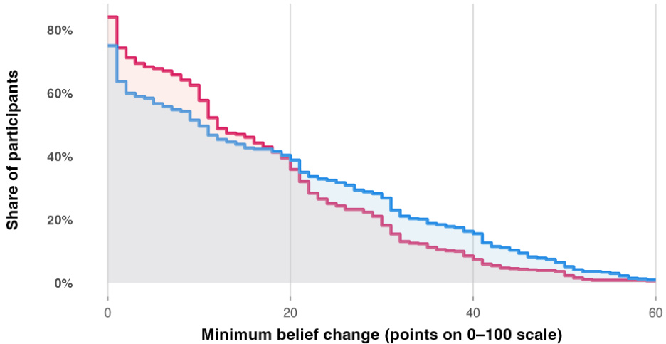 [page::3] - 说明:该图展示从 baseline 49% 到 post 99% 的极端个案,AI 通过“引用细节(classified documents、lab results)+情绪共鸣+行动号召”形成强烈说服链条;作者用该个案来示范模型如何 escalate commitment 与动员。该图支持论文关于 AI 能“将不确定者转为坚定信徒”的论断,但该个案并不能代表平均效应分布的尾部特征(个案说明机制而非统计普适)[page::3]。