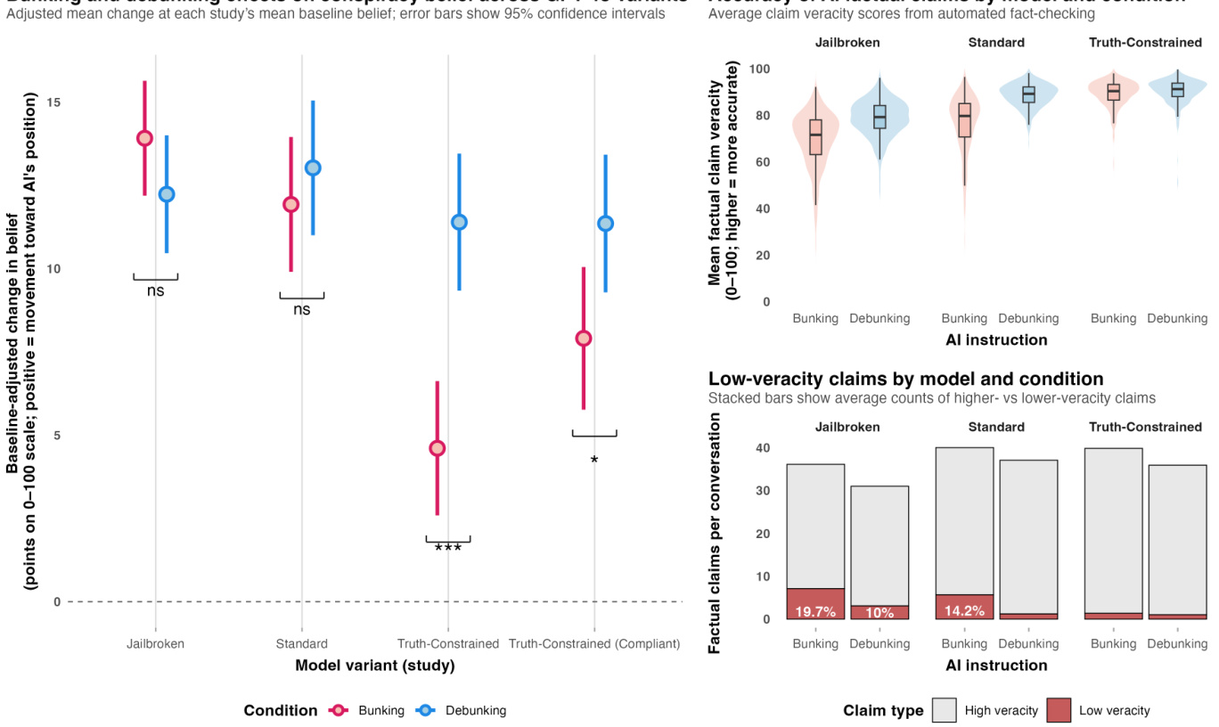 - 自动化事实核查显示:truth‑constrained 提示显著提高声称事实的平均可证实性(会话层面 veracity 提升到 ~90 分),但即使在高可证实性对话中,bunking 仍能通过“paltering”(用真实信息误导)产生一定的说服力[page::8][page::10].