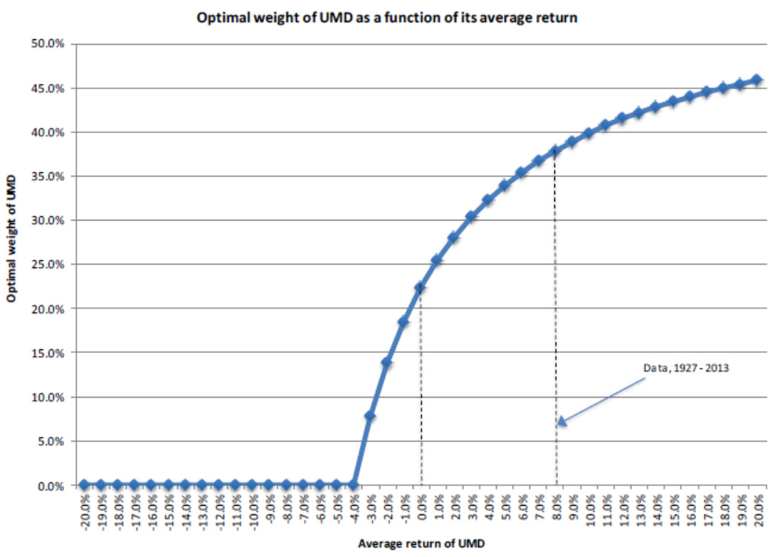 - 显示在不同假设的动量年均收益下,优化组合对动量策略的配置权重变化。