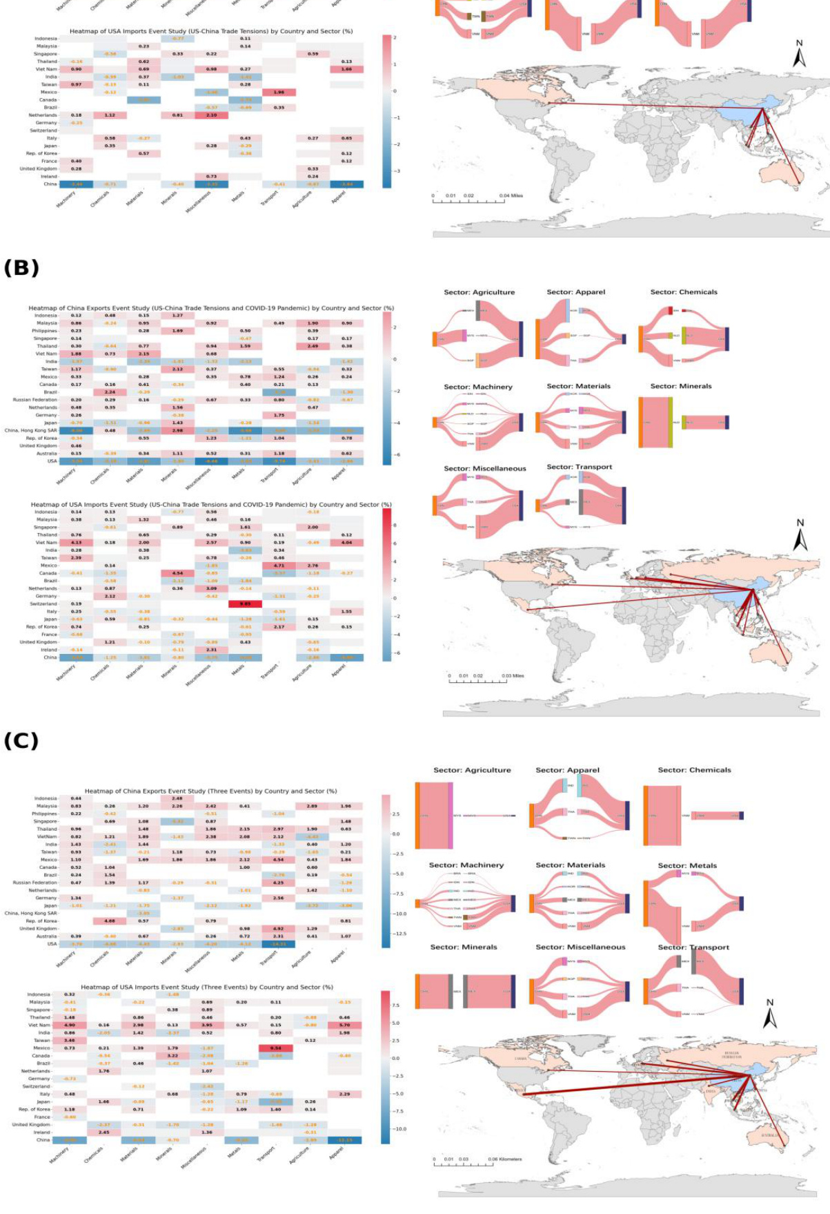 - 描述: 事件研究热图分析了美中贸易战起点、疫情叠加期及三重危机下,中国出口与美国进口按国家及部门的百分比变化。右侧空间流向图展示主要贸易流重定向。