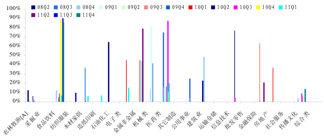 - 描述:多期行业配置比例柱形图,覆盖2008年Q2至2011年Q1共14期。