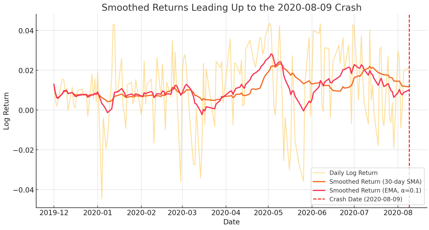 - 描述:展示日对数收益(黄色波动线)及 30 日 SMA 与 α=0.1 EMA 平滑曲线,时间区间 2019-12 至 2020-08。红色虚线标示崩盘日。 [page::9]