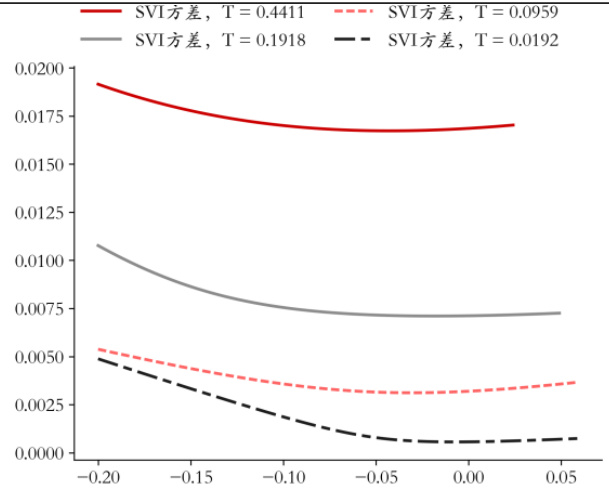- 描述:各期限SVI模型拟合结果与市场隐含方差数据高度一致,且多期限隐含方差曲线不交叉。