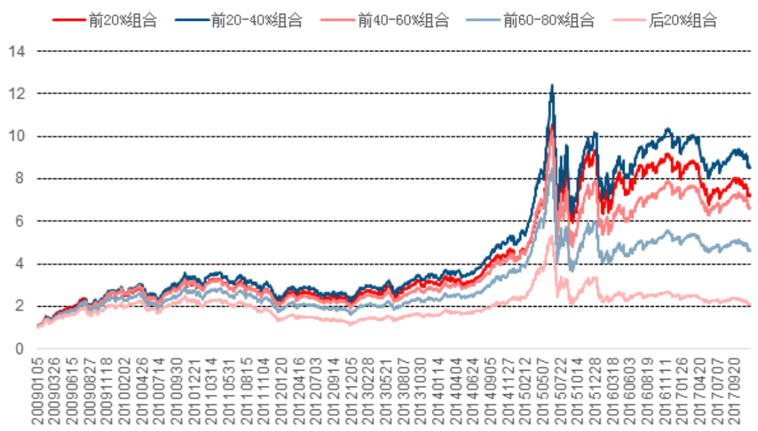 - 回测2009年至2017年,前两个分组的年化收益均超过25%,而第三组以上逐步下滑,最低组不到10%。