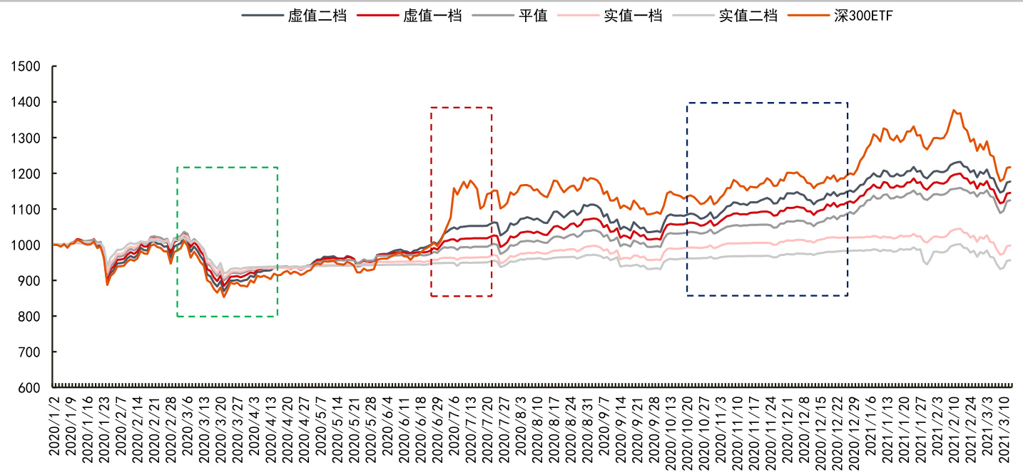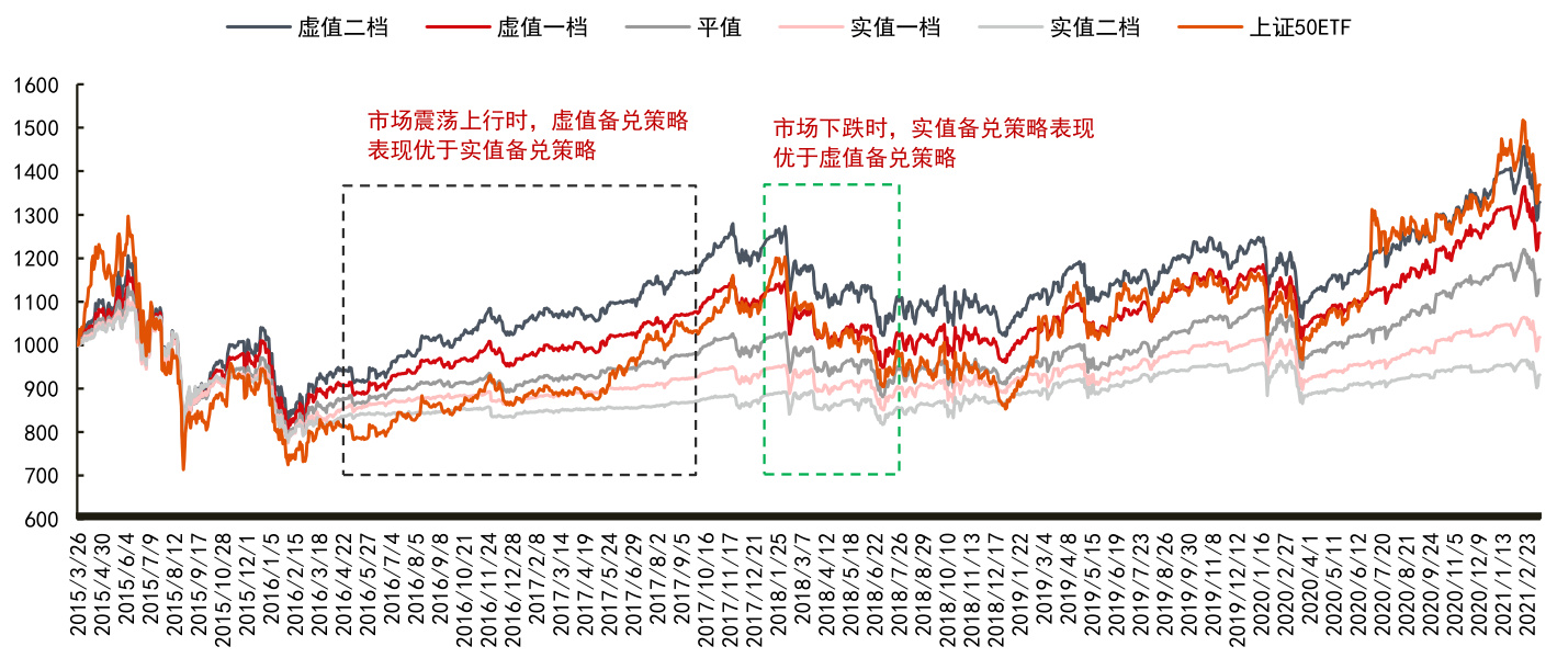 - 显示虚值备兑策略在震荡上扬阶段表现优于实值备兑,实值备兑在市场下跌阶段抵御效果更佳。