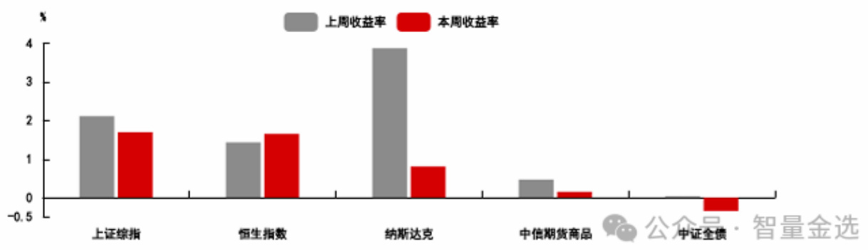 - 描述:该柱状图比较了上周与本周多个主要指数(上证综指、恒生指数、纳斯达克、中信期货商品指数、中证企债)的周收益率。
