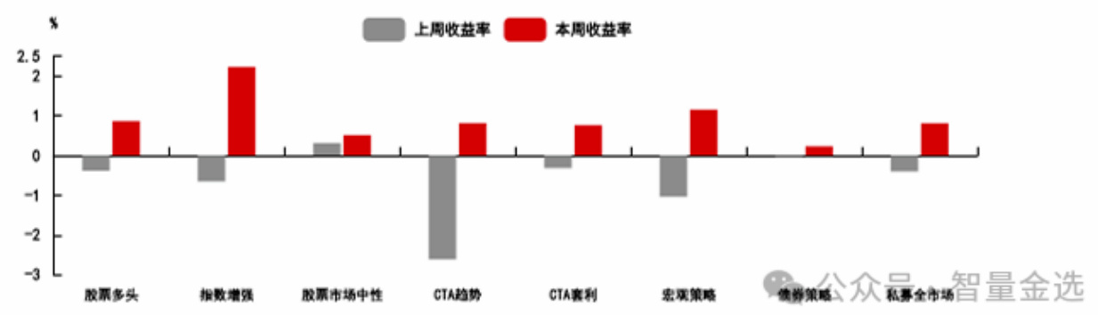 - 公募和私募基金策略全线上行,指数增强与宏观策略表现尤为突出。