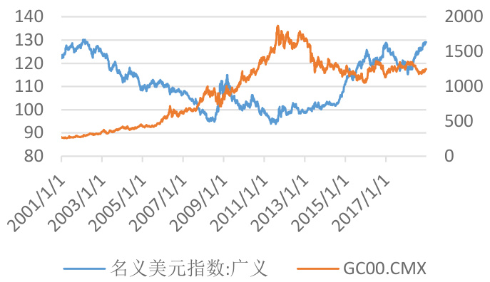 - 广义美元指数与黄金价格长期呈明显反向变动。