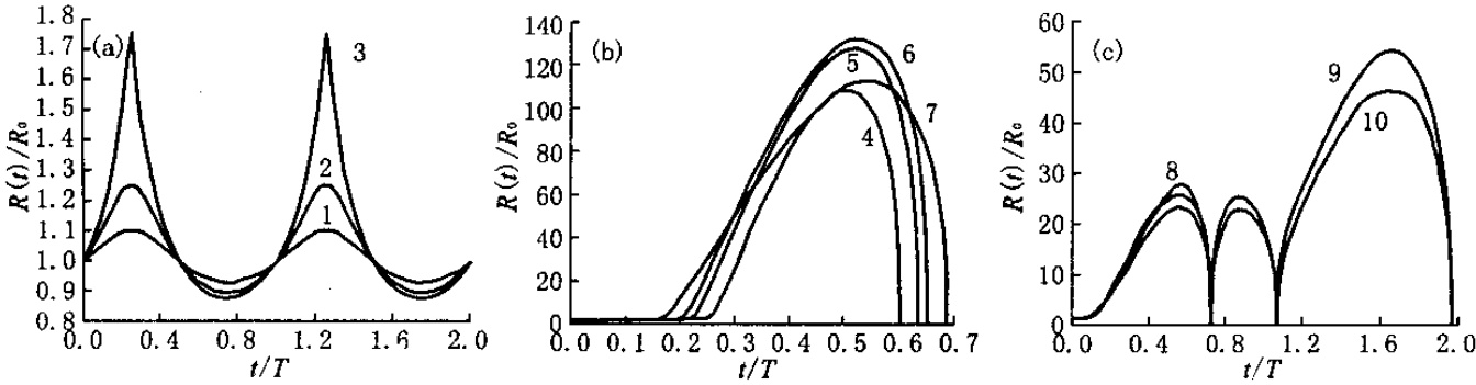 - $R0$超过一定值时,运动峰数增加,运动复杂;过大时恢复为稳态空化但半径显著增大。