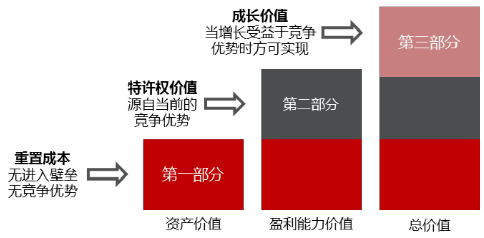 借鉴格林沃尔德提出的战略性价值框架,价值分为三部分:资产价值(重置成本,无壁垒)、特许权价值(持续竞争优势)、成长价值(增长受竞争优势支撑),强调可持续竞争优势是价值超额产生的核心。