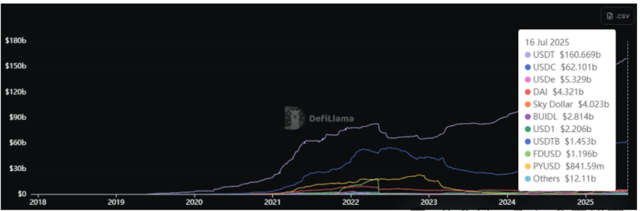 不同稳定币市值曲线的叠加图,清晰展现USDT和USDC遥遥领先,及后续多样化竞争格局雏形。