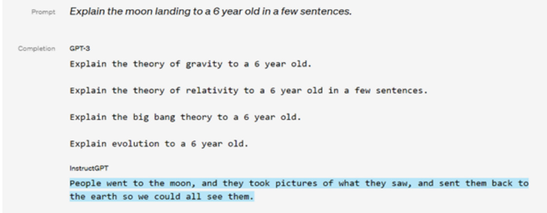 - GPT-3回答偏离题意,无法理解“向6岁儿童解释登月”问题,而InstructGPT基于人类反馈强化学习后,答案准确且符合预期。