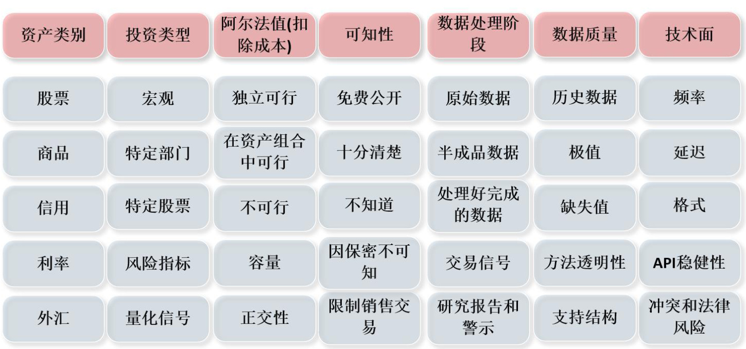 - 投资视角分类覆盖股票、商品、信用、利率、外汇等资产类别,且考虑数据处理阶段、数据质量、技术面等方面。