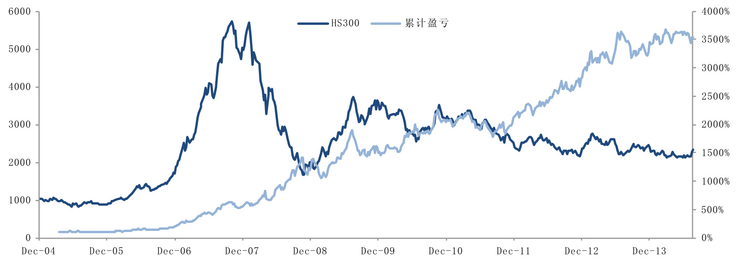 - 描述:蓝色线为沪深300走势,浅蓝色线为基于GSISI择时模型的累计盈亏曲线。