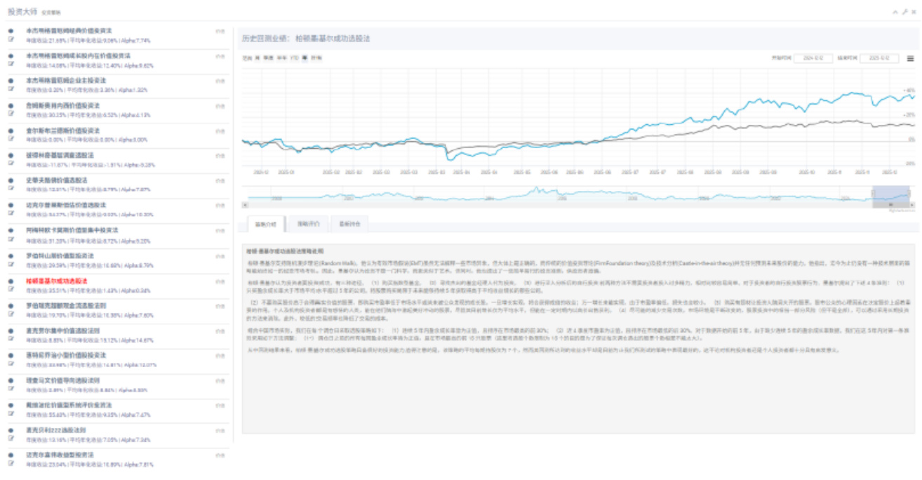 - 大师/选股监控:平台监控33个大师策略(价值/成长/综合),用于识别收益靠前组合的因子暴露与建仓标准,界面与回测曲线见下图[page::8]。
