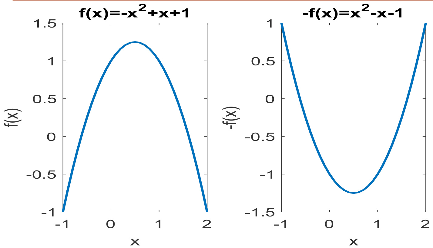 图形左侧展示函数$f(x) = -x^2 + x + 1$的曲线,其在$x=0.5$处取得最大值,大致为1.25。右侧对应函数$-f(x)=x^2 - x -1$,在同一点$x=0.5$取得最低值约$-1.25$。这体现了最大化目标转化为最小化目标的做法,为后续优化模型表述提供基础直观示范[page::5]。