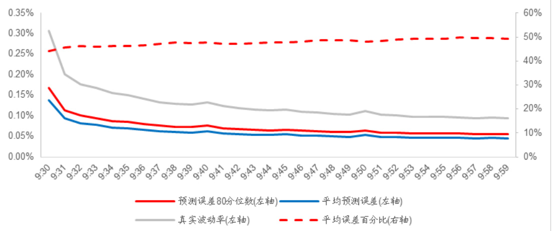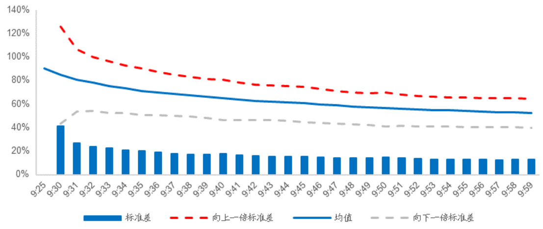- 解读:均值从约80%递减至50%,同时波动率很高,开盘首分钟波动率高达40%,第五分钟保持20%以上,反映开盘首段价格波动剧烈,带来极大不确定性,增加预测难度。