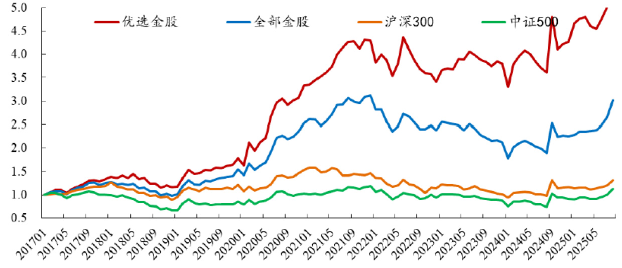 - 优选金股组合长期保持高出其他组合和基准指数。