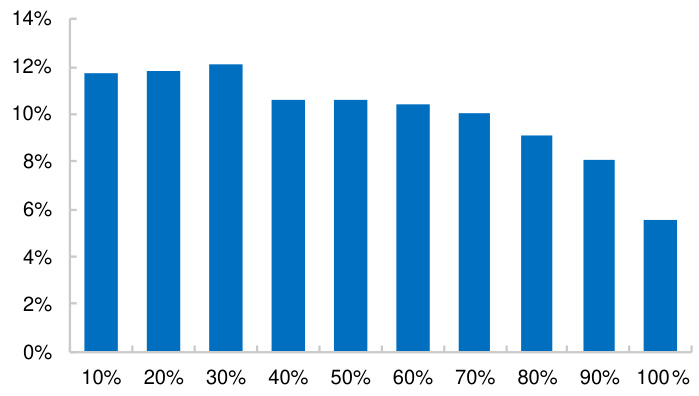 - 策略年化收益49.9%,信息比1.33,超越Wind全A指数46.1%的年化超额收益和信息比1.51。策略每年均实现正收益[图11,表9]。