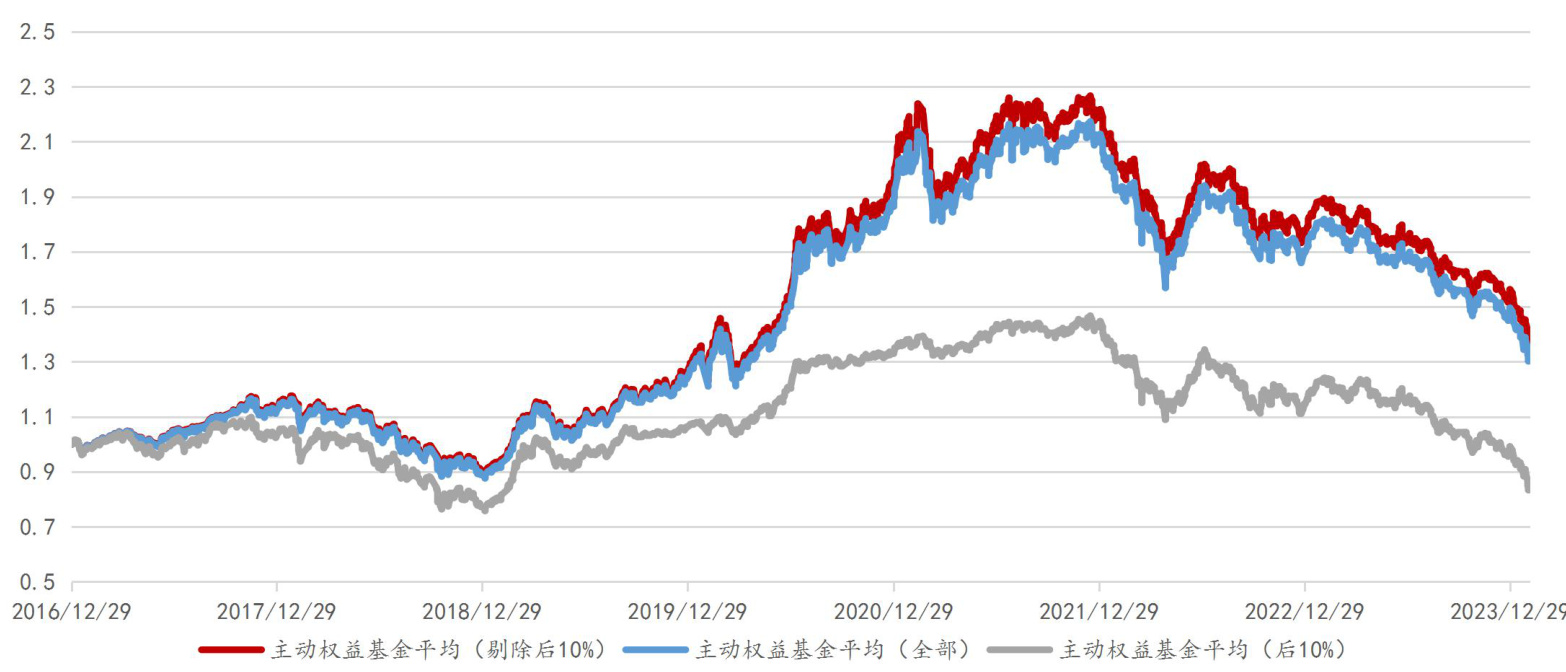 | 年份 | 主动权益基金平均(剔除后10%) | 主动权益基金平均(全部) |