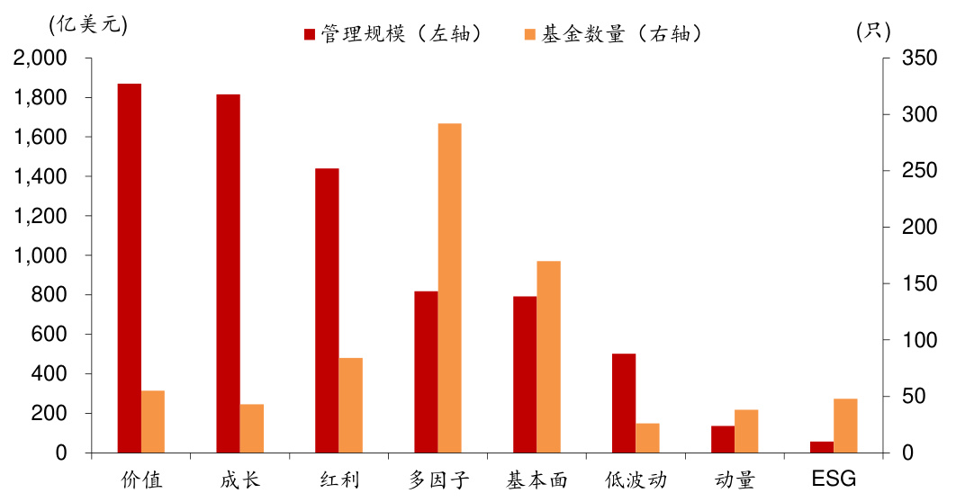 - 美国Smart Beta ETF中价值和成长产品规模均约占市场22%,叠加管理规模领先其他因子产品,表现出“双主线”格局。