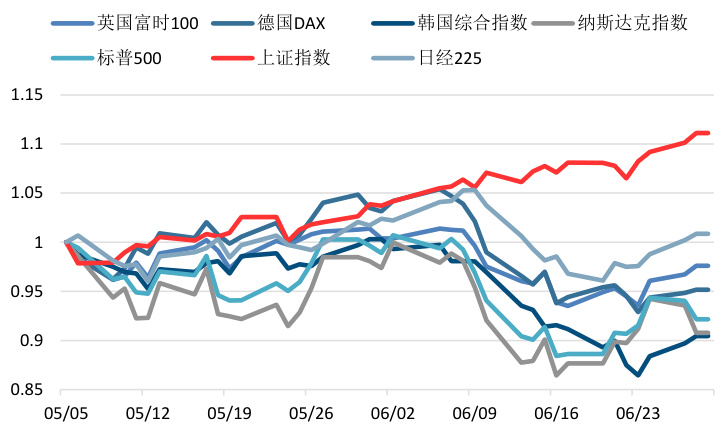 - 图表5全球主要股市走势相比,A股上证指数在6月外围调整期表现坚挺且独秀,显示市场韧性增强。