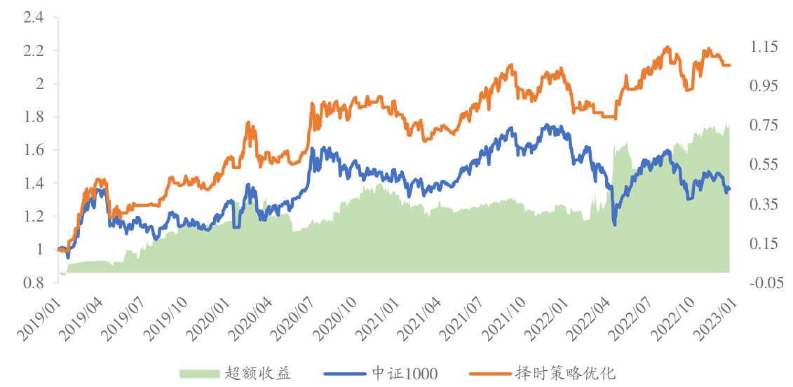 - 图12(第19页):优化后中证1000择时策略累计净值线(橙色),与基准中证1000指数(蓝色)和超额收益面积(绿色)对比,清晰展现策略收益和超额收益的增长且波动控制良好。