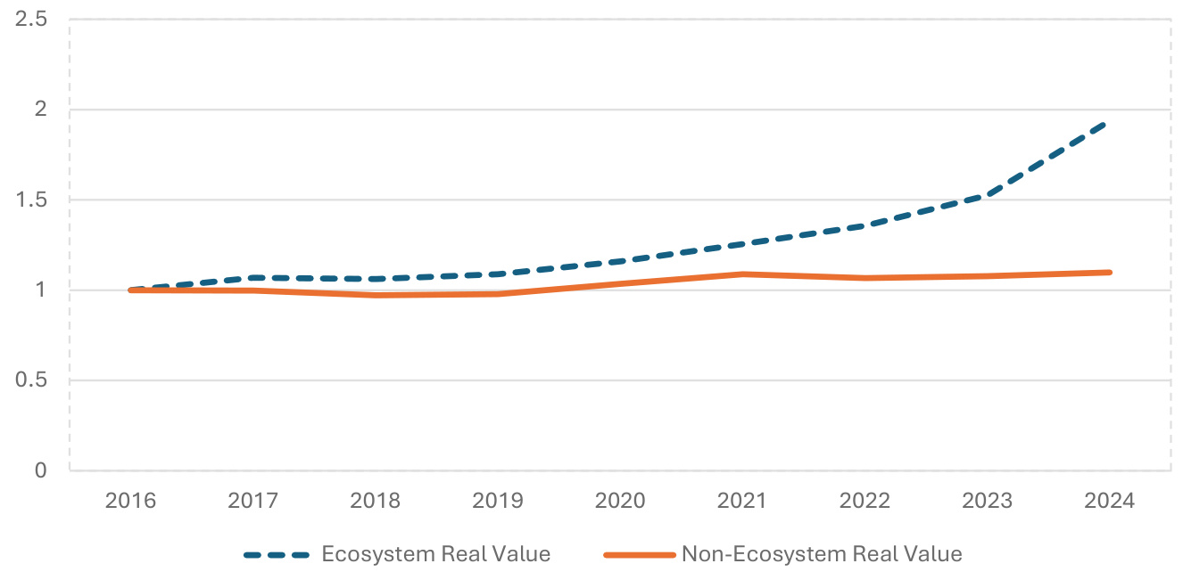 - 解读:两类期刊2016年前后趋势基本平行,2019年后生态系统期刊文章量开始快速提升,2024年达到基准的4.2倍左右,远超非生态系统的1.45倍,显示生态系统带来的发布活力明显增长。