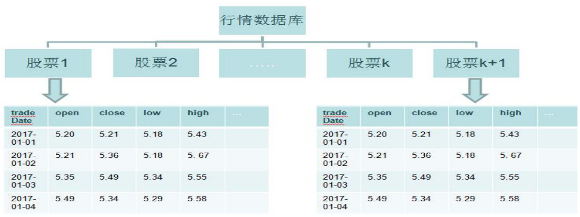 - 描述股票行情数据的存储结构:多股票,每支股票一个二维表,行交易日,列行情字段(开盘、收盘、最高、最低等)。