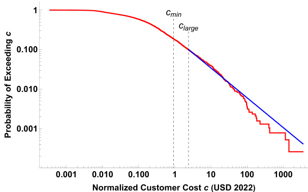 - 描述:横轴为标准化客户成本$c$,纵轴为事件成本超过$c$的概率。红色为实际数据阶梯线,蓝色为拟合的Pareto幂律尾线。