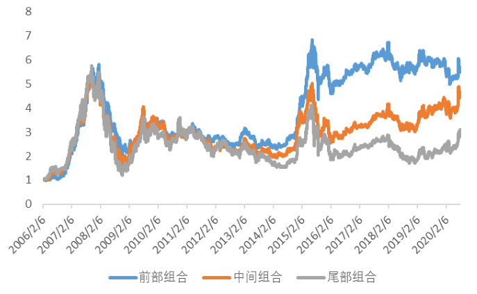 展示了低波动率(前部)组合的净值线明显抬高,较中间和尾部组合稳健上升。说明低波动率因子具有较好的市场表现和风险控制能力。配合表3数据(累计收益449.52%、夏普率0.52)支持低波动率组合投资价值[page::7,8]。