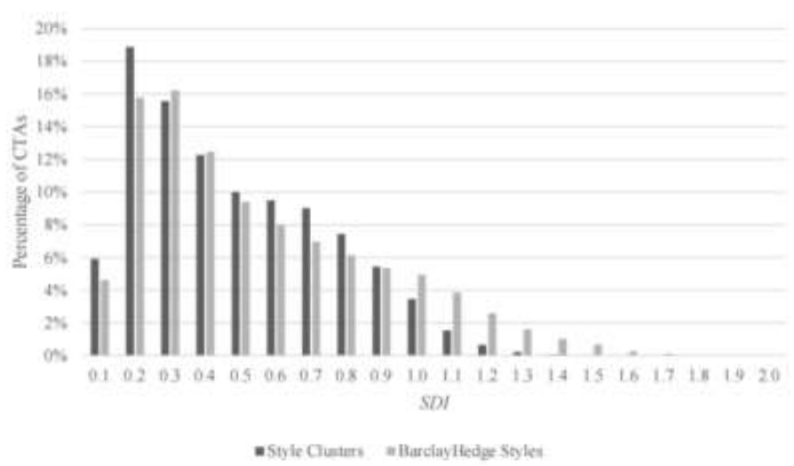 - 描述:展示基于聚类风格划分(深色柱)与BarclayHedge自报风格划分(浅色柱)得到的CTA基金SDI分布。