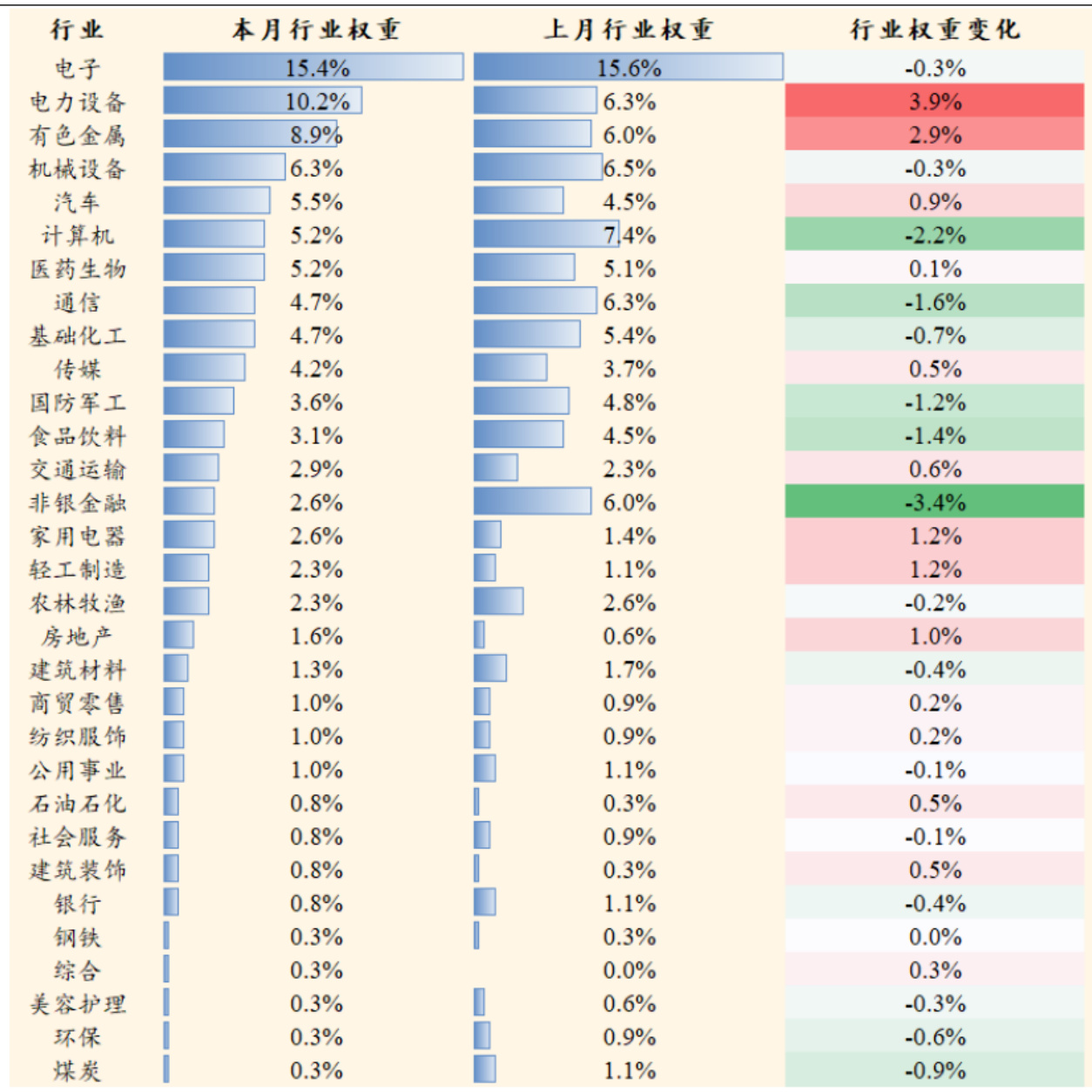 - 电力设备、有色金属等行业权重环比明显提升,非银金融、计算机等行业权重下降。