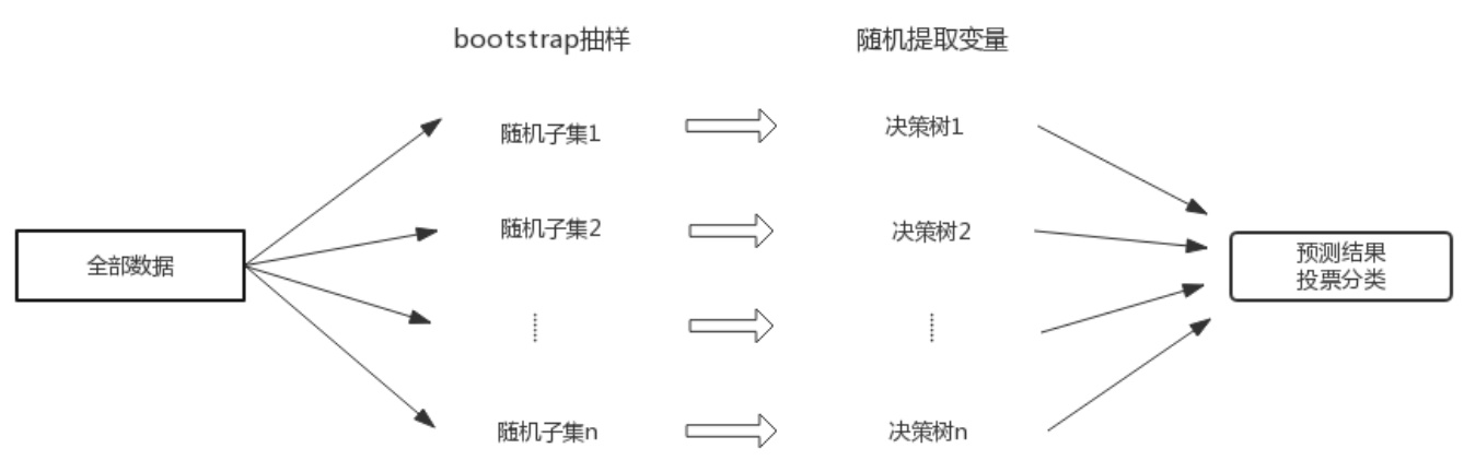 - 展示随机森林通过 bootstrap 抽样得到多个决策树,最终以投票方式输出预测分类结果。