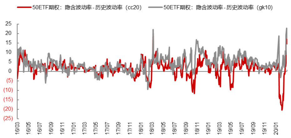 - 图中两条曲线分别代表不同计算方式(cc20与gk10)下价差的时间序列,显示波动率溢价结构异常。