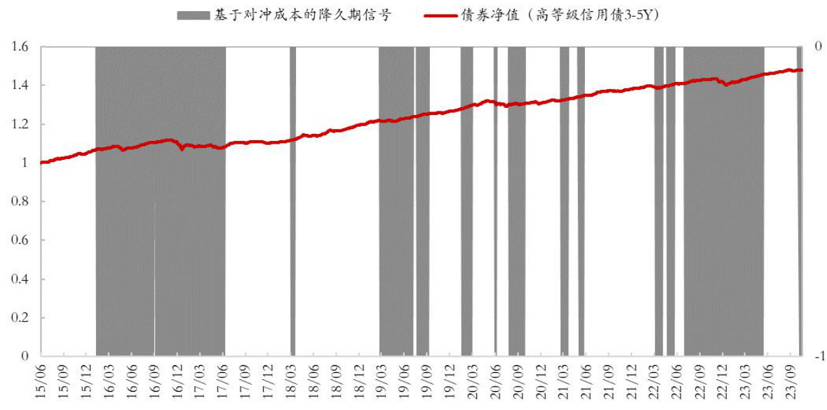 - 图表8中,灰色条形的是基于对冲成本指标触发的降久期信号期,红线是3-5年高等级信用债净值。信号多集中于信用利差显著扩大的阶段,表明模型及时调整持续时间正确。