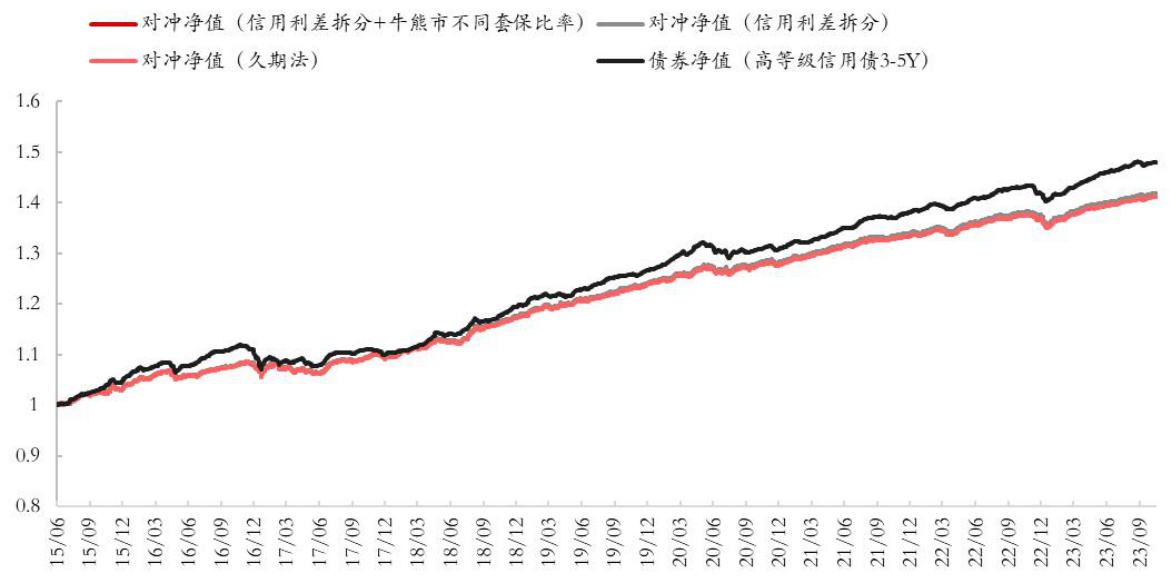 图中展示基于三种对冲模型(信用利差拆分+牛熊市套保、生信用利差拆分法、久期法)以及未对冲的高等级信用债3-5年指数的净值变化: