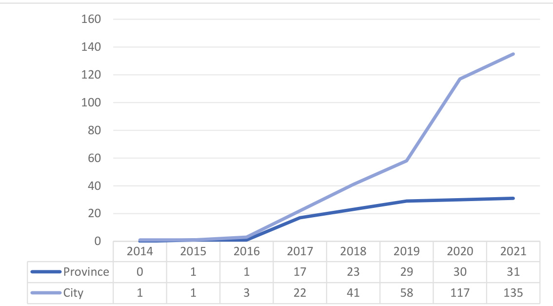 - 2017 年至 2021 年间,省级制度覆盖逐渐稳定在31个省,地市级由几个增长至135个,体现中国治理体制的系统推广和制度标准化趋势。