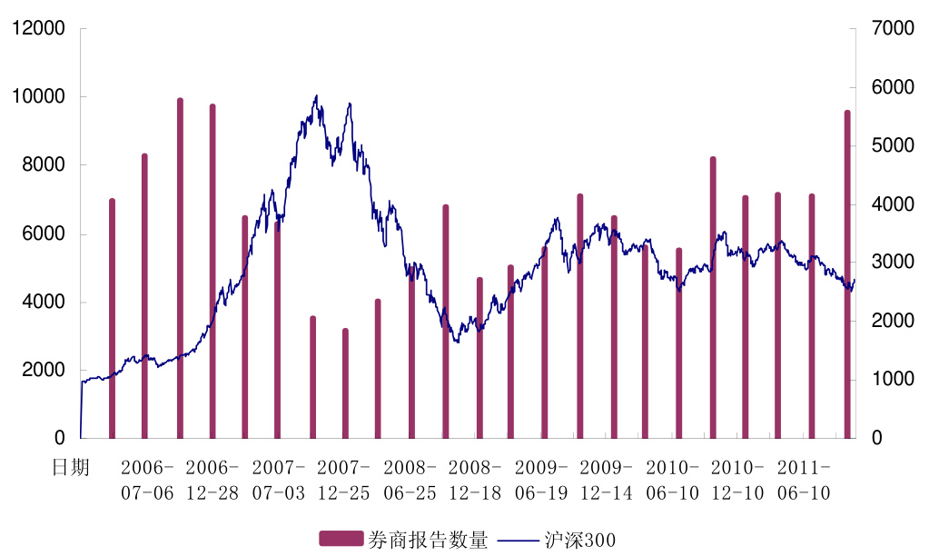 - 描述:柱状图为各季度券商发布的研究报告总数量(数值区间从约0到10000+),折线图代表对应季度或下季度沪深300指数水平(数值区间0至12000)。