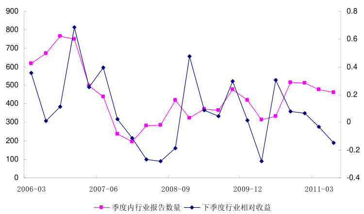 - 描述:粉色曲线表示季度内券商报告总数变动,蓝色折线表示下季度沪深300指数收益率波动。
