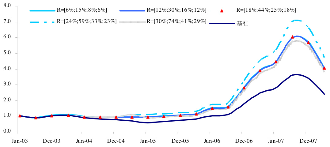 - 描述:显示不同风险收益参数(R=组合)下2003年6月至2007年12月BL组合累积超额收益倍数走势。