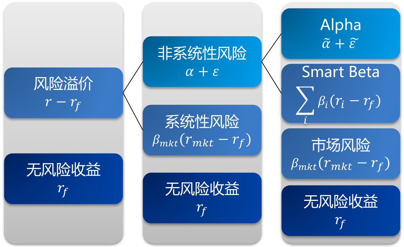 - 非系统性风险部分包括Alpha(超额收益)和Smart Beta(基于风险因子特征的收益)。