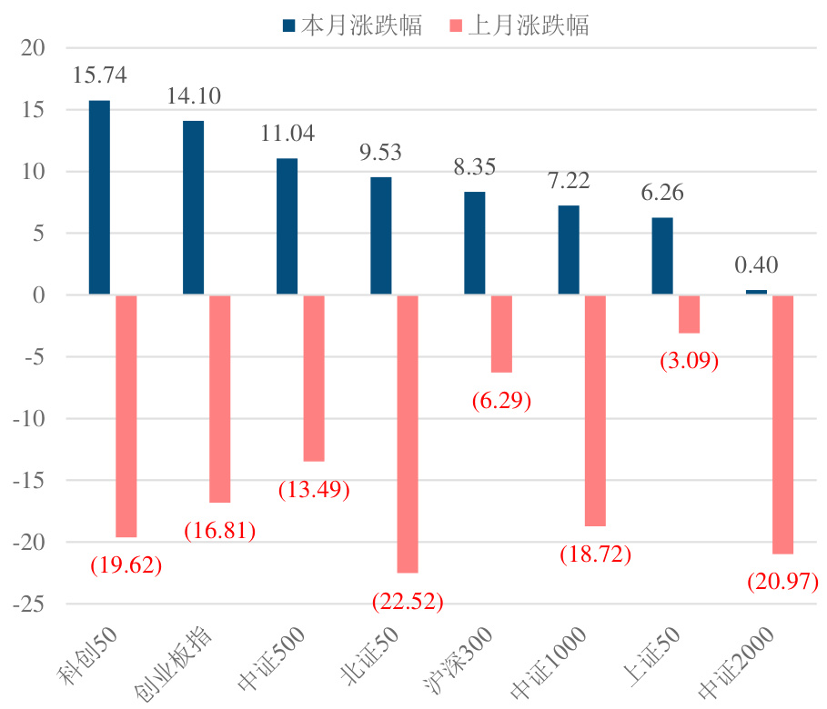 - 科创50指数领涨,涨幅超15%,沪深300及中证500表现稳健,年初至今各主流指数均呈现明显回升。