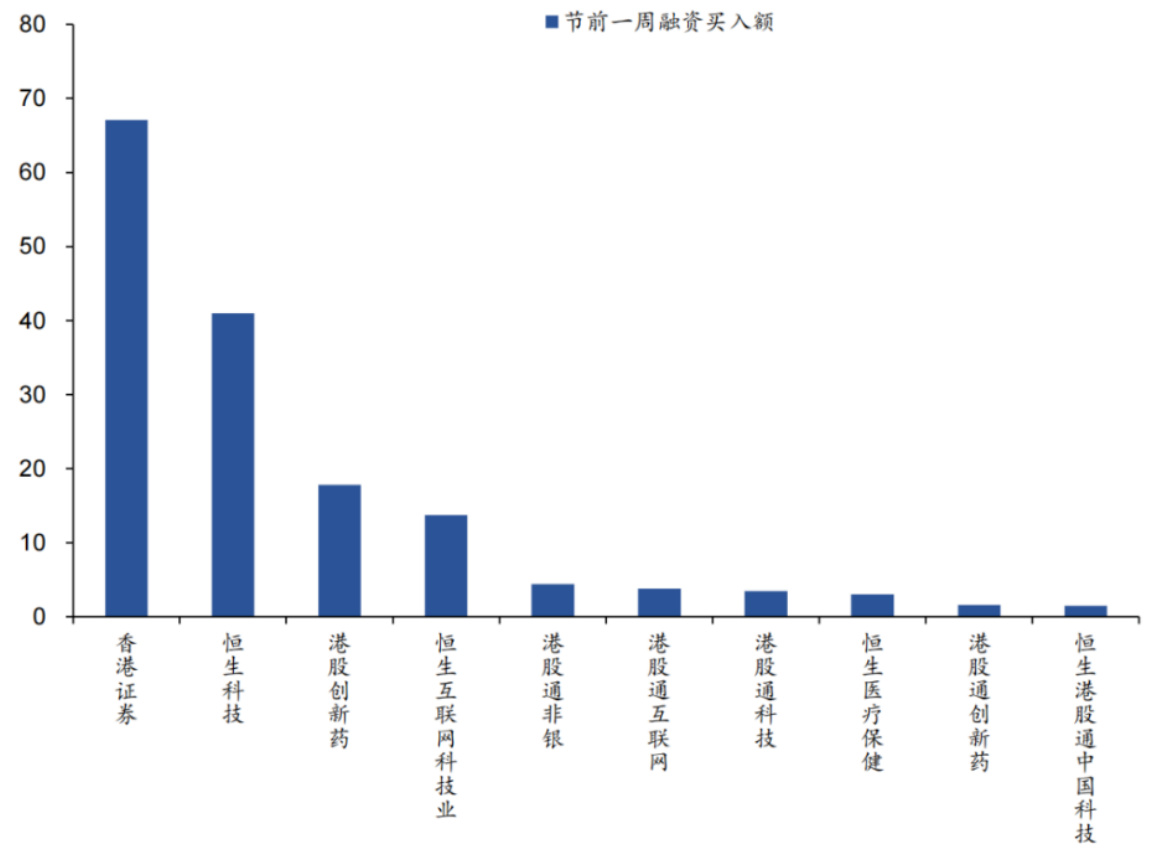 - 节前一周融资买入额靠前的是香港证券ETF(67亿元)和恒生科技ETF(23.38亿元)。