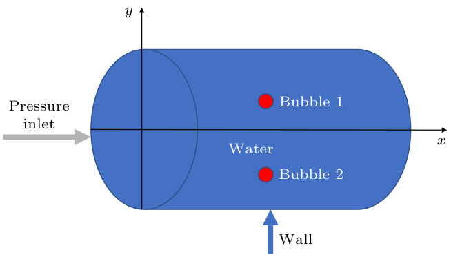 - 描述:展示有限元模型的几何结构及初始条件,包括圆柱流体区域和两个气泡的位置分布(双气泡分别标记为Bubble 1和Bubble 2),左侧为声压入口,壁面设为刚性。