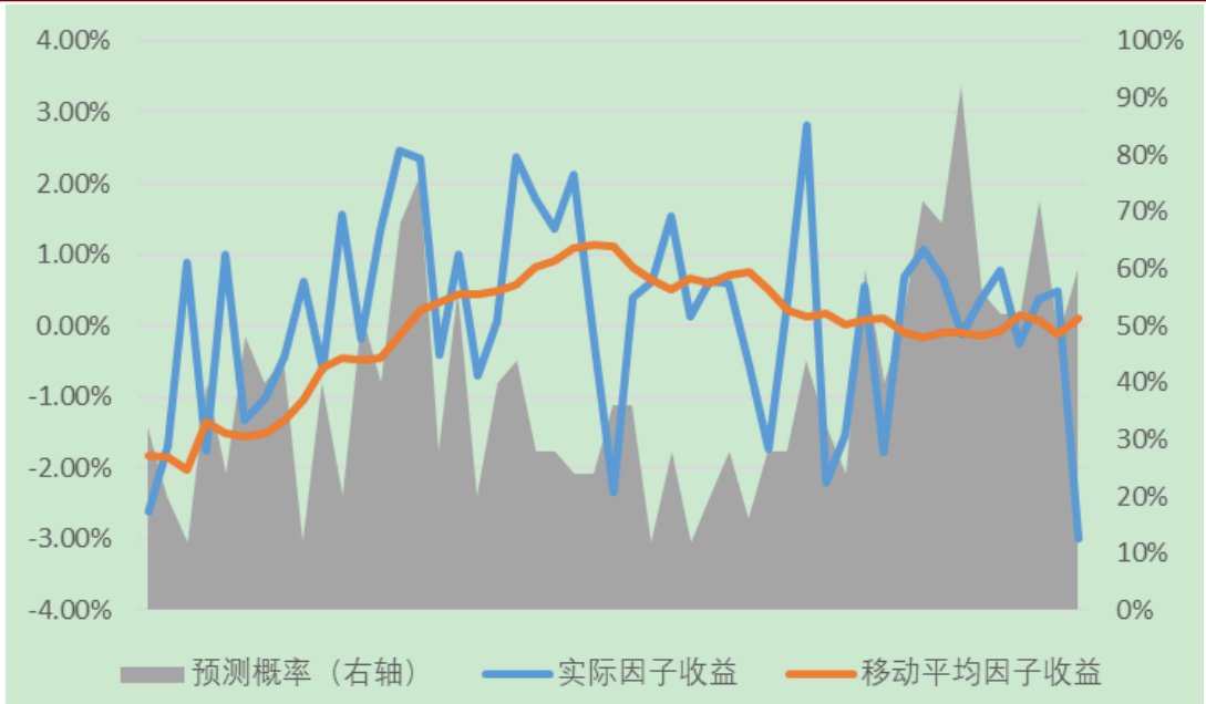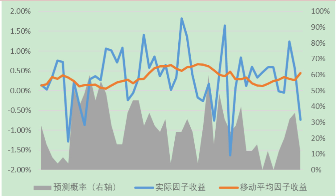 - 图示展示多种因子择时情况下,实际收益与移动平均收益曲线对比,以及模型预测概率,用以说明机器学习模型有效捕捉短期因子走势,优于单纯移动平均预测。