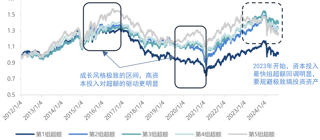 以资本资产同比变化刻画资本投入,分为5组。高资本投入股票长期表现优于低投入组,分组排名不稳但趋势明显,2015-2016及2020年成长风格中高投资带来显著超额收益。2023年起资本投入领先组业绩出现调整,提示需规避过度激进投资[page::5]